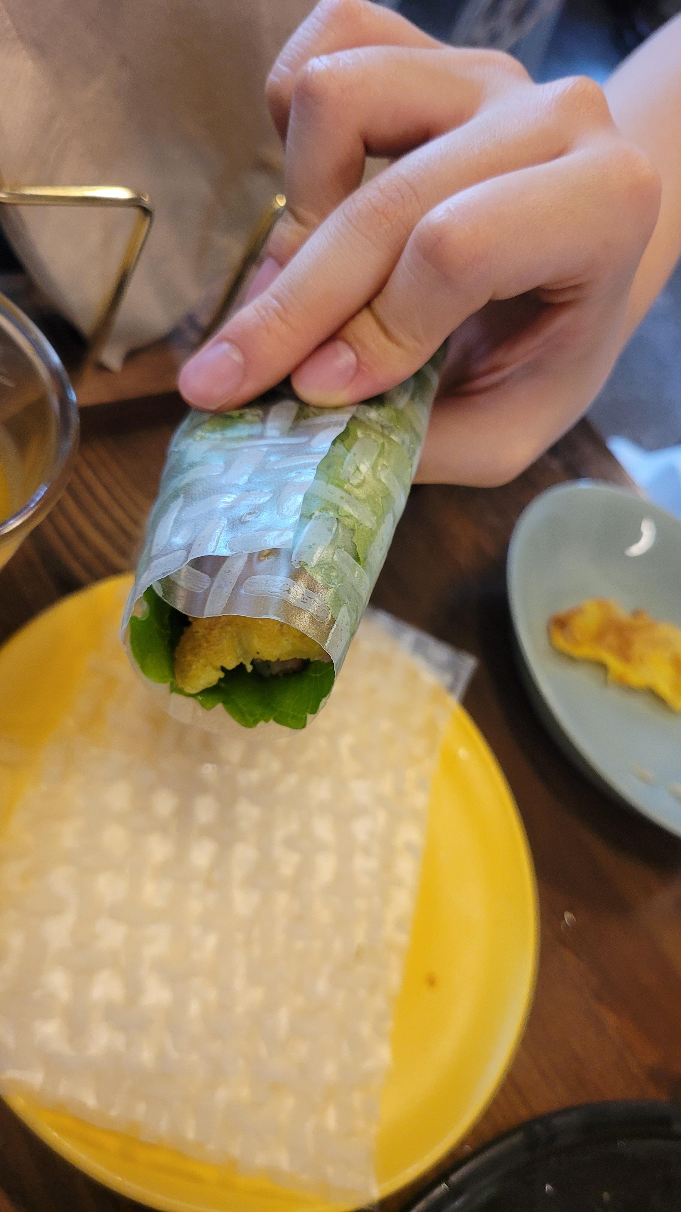 같이 주시는 라이스페이퍼에 싸서 먹는 음식인데 라이스페이퍼를 물에 적시지 않고 그대로 싸서 먹는데 딱딱하지 않고 부드러웠어요~